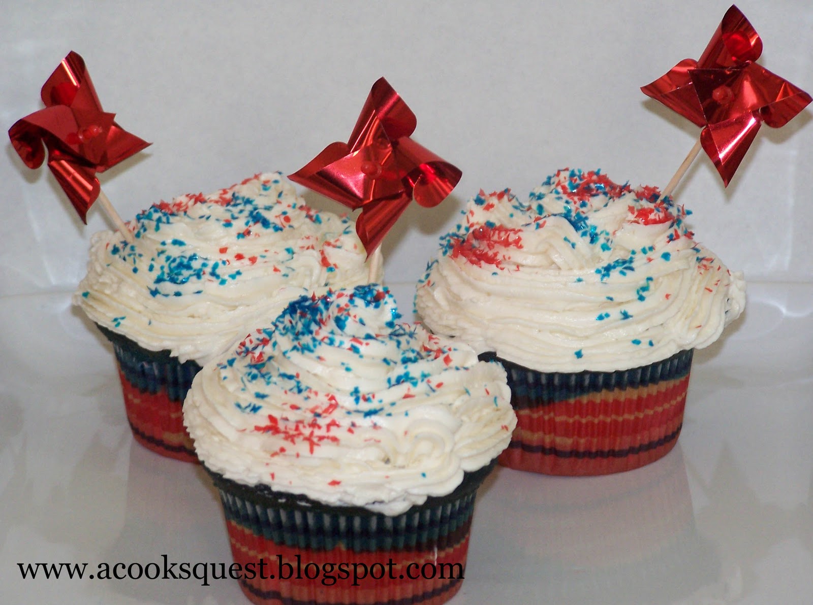 I couldn't post a frosting recipe with no cake for it to go on! I wish I could claim the clever idea for these darling little cupcakes, but I can't. I saw the 4th of July idea at Fabulously Frugal when they posted thrifty treat ideas for you holiday get together, and a few months ago I saw the same idea at Our Italian Kitchen. I knew this would be project that the kids could participate in, and the final result would be all the better for their help!