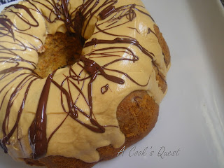 As pound cakes go this one fits the bill. It is dense, but moist, and very full of flavor. Alone it reminds me of a peanut butter cookie in cake form, but then the frosting is added leaving the eater with a peanut butter explosion of flavor...oh yes, it was tasty! I didn't change a lot about the recipe. I doubled the amount of vanilla, thinned the frosting so that it was more of a glaze, and added a chocolate drizzle on top for hubby. I did find that it took 1 hour and 20 minutes to finish baking. This may be due to the size of my pan. I used a large stoneware fluted pan that utilized "most" of my batter. If you make this, be sure to begin checking your cake for doneness at about 55 minutes. ENJOY!!